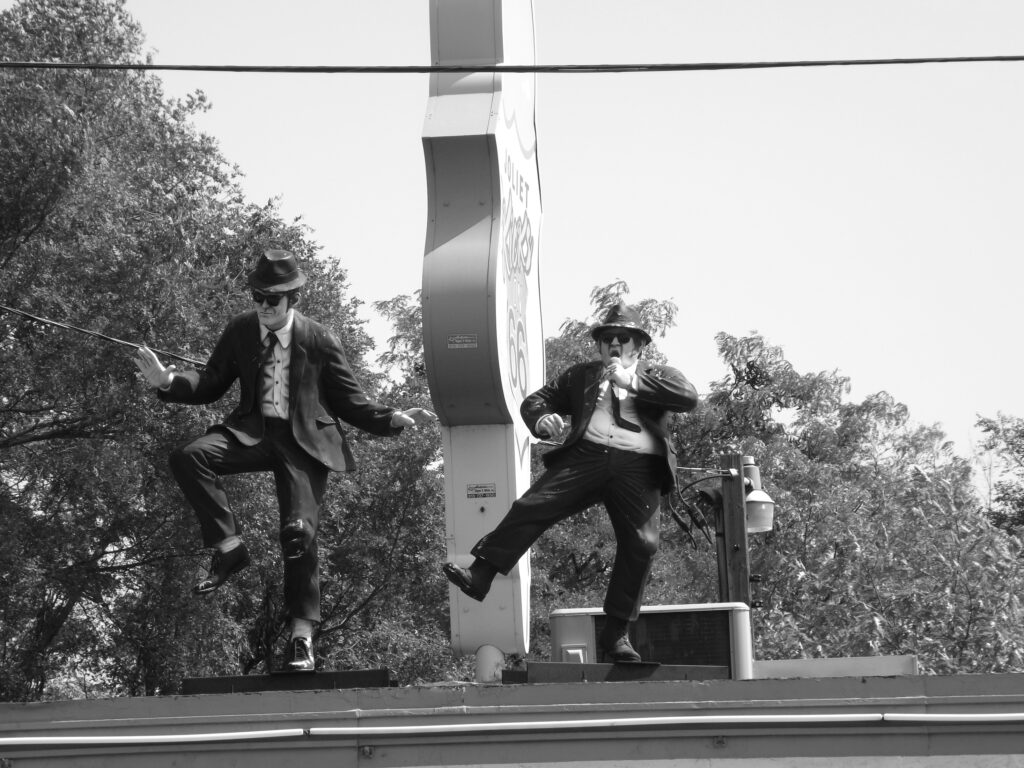 Statues on top of the building in honor of the Blue Brothers (from the movie) and Joliet, IL where the photo was taken.